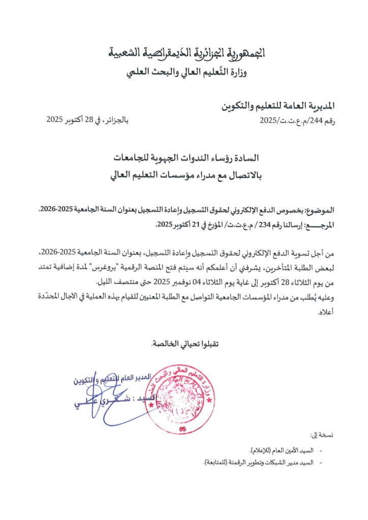 آخر الأخبارإعلاناتالمستجدات بخصوص الدفع الالكتروني لحقوق التسجيل و إعادة التسجيل بعنوان السنة الجامعية 2026/2025 شاركها فيسبوك تويتر لينكدإن مشاركة عبر البريد Post Views: 4 شاركها فيسبوك تويتر لينكدإن مشاركة عبر البريد شاركها فيسبوك تويتر لينكدإن مشاركة عبر البريد طباعة
