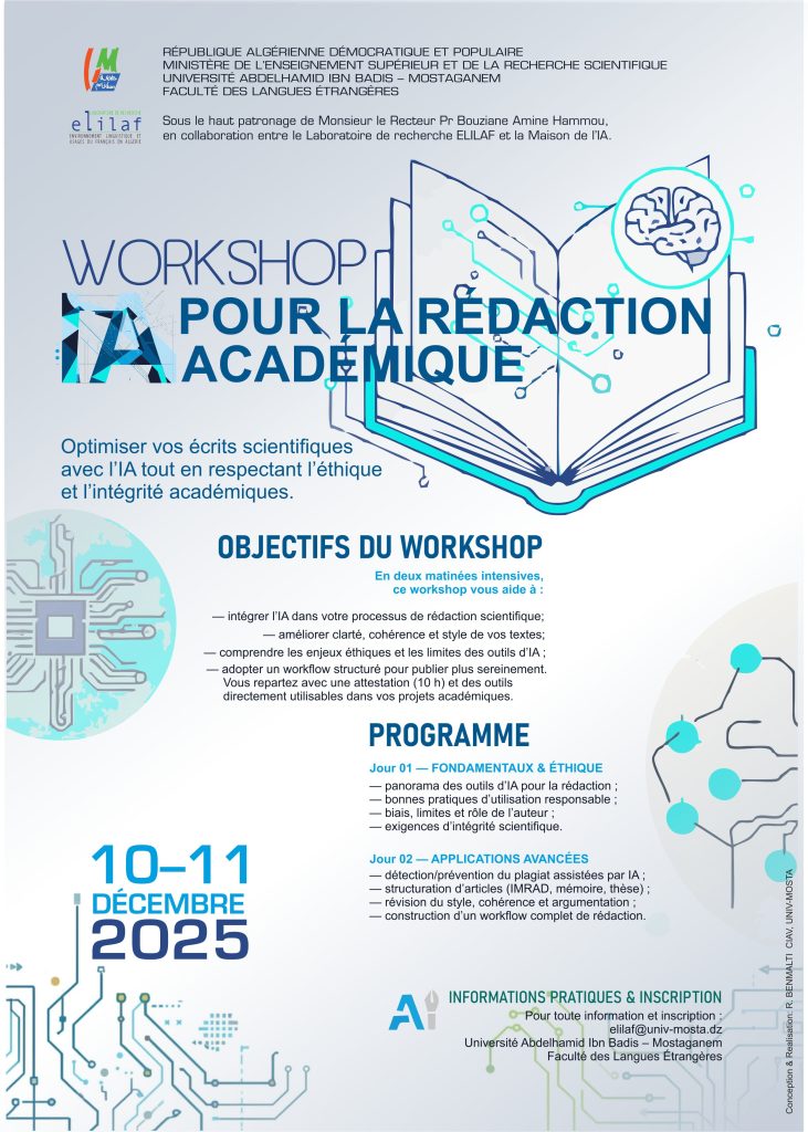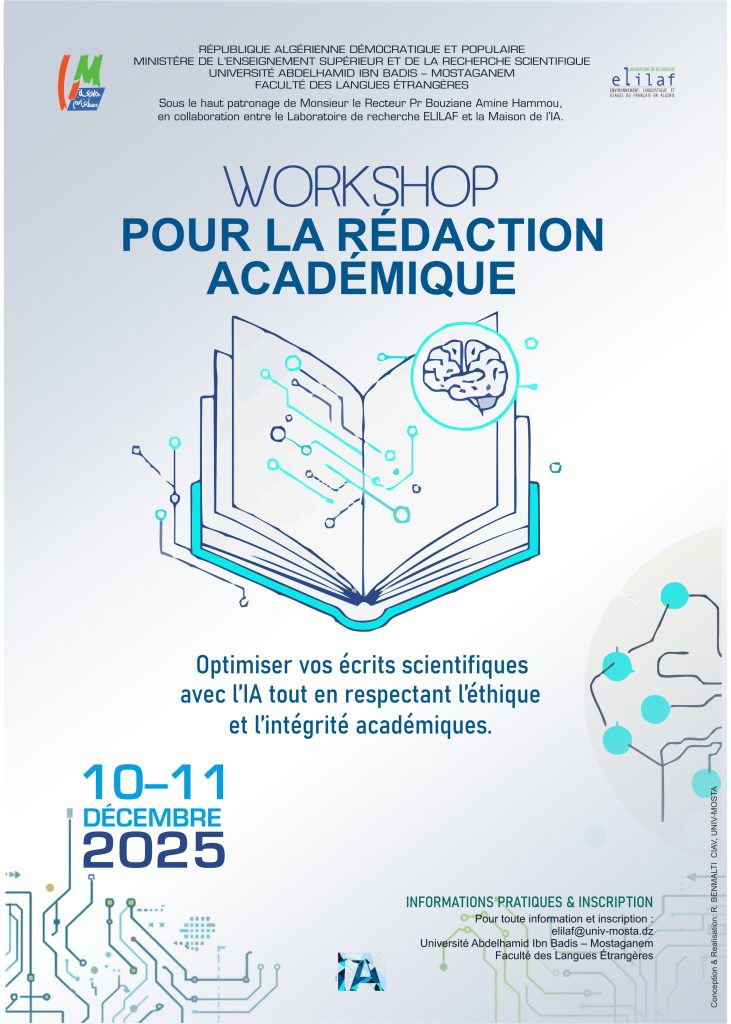 Accueil/Actualités/Journée d’étude « Workshop pour la Rédaction Académique » Actualités Journée d’étude « Workshop pour la Rédaction Académique » il y a 1 heure 4 Facebook Twitter Linkedin Tumblr Pinterest Reddit VKontakte Odnoklassniki Pocket Post Views: 3 il y a 1 heure 4 Facebook Twitter Linkedin Tumblr Pinterest Reddit VKontakte Odnoklassniki Pocket Partager Facebook Twitter Linkedin Tumblr Pinterest Reddit VKontakte Odnoklassniki Pocket Partager par email Imprimer