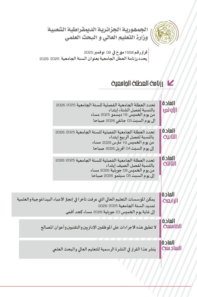 رزنامة العطل الجامعية بعنوان السنة الجامعية 2025-2026
