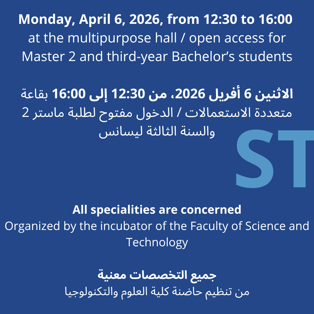 « ندعو طلابنا المسجلين في السنة الثالثة ليسانس والسنة الثانية ماستر للانضمام إلى هذه الورشة، للاستفادة من هذه الفرصة المزدوجة.