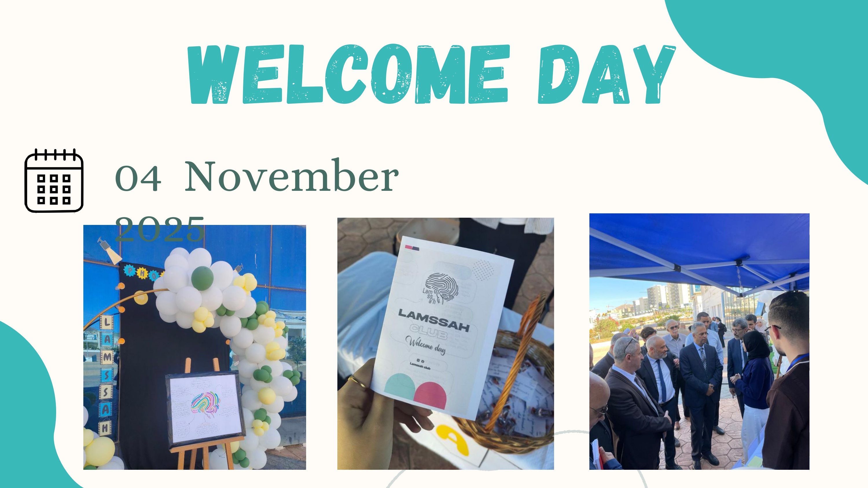 | مواصلة عملية تسجيل الطلبة واستقبال رئيس الجامعة لدى زيارته للكلية | اليوم الافتتاحي للنادي العلمي | 20 مشاركا | كلية الطب | نادي LAMSSAH | علمي/ثقافي | 05.11.2025 |