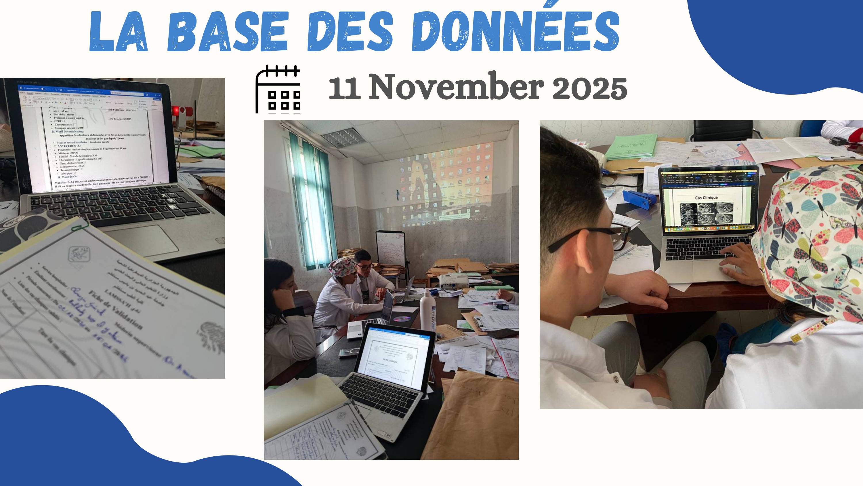 | الشروع في مشروع قاعدة بيانات الحالات السريرية من طرف الطلبة بالتعاون مع الأساتذة الاستشفائيين الجامعيين في كل من مصلحتي الجراحة العامة والطب الداخلي | قاعدة بيانات الحالات السريرية | 18 مشاركا | كلية الطب والمركز الاستشفائي الجامعي | نادي LAMSSAH | علمي | 11.11.2025 |