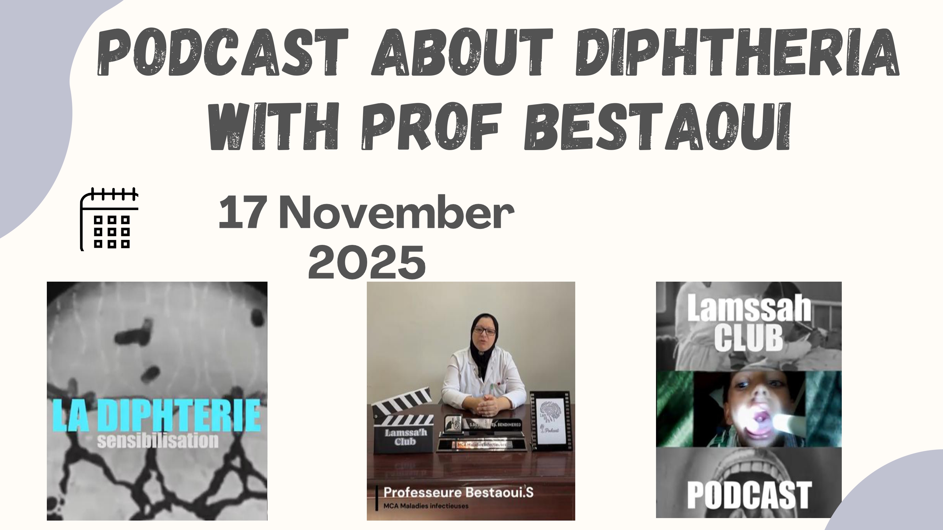 | فيديو توعوي مع طبيبة مختصة في الأمراض المعدية بسطاوي حول مرض الديفتيريا، مخاطره وكيفية الوقاية منه | بودكاست حول مرض الديفتيريا | 10 مشاركين | على الأنترنت | نادي LAMSSAH | علمي/تحسيسي | 16.11.2025 |