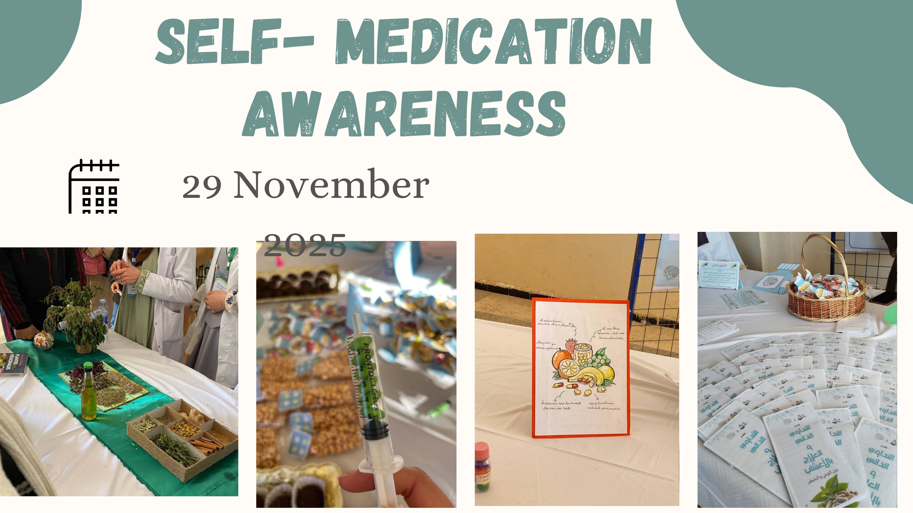 | توعية الناس حول مخاطر ومضاعفات تناول الأدوية والأعشاب دون استشارة الطبيب وما تسببه من مضاعفات | حملة توعوية حول مخاطر التداوي الذاتي | 30 مشاركا | المكتبة المركزية | نادي LAMSSAH | علمي/تحسيسي | 30.11.2025 |