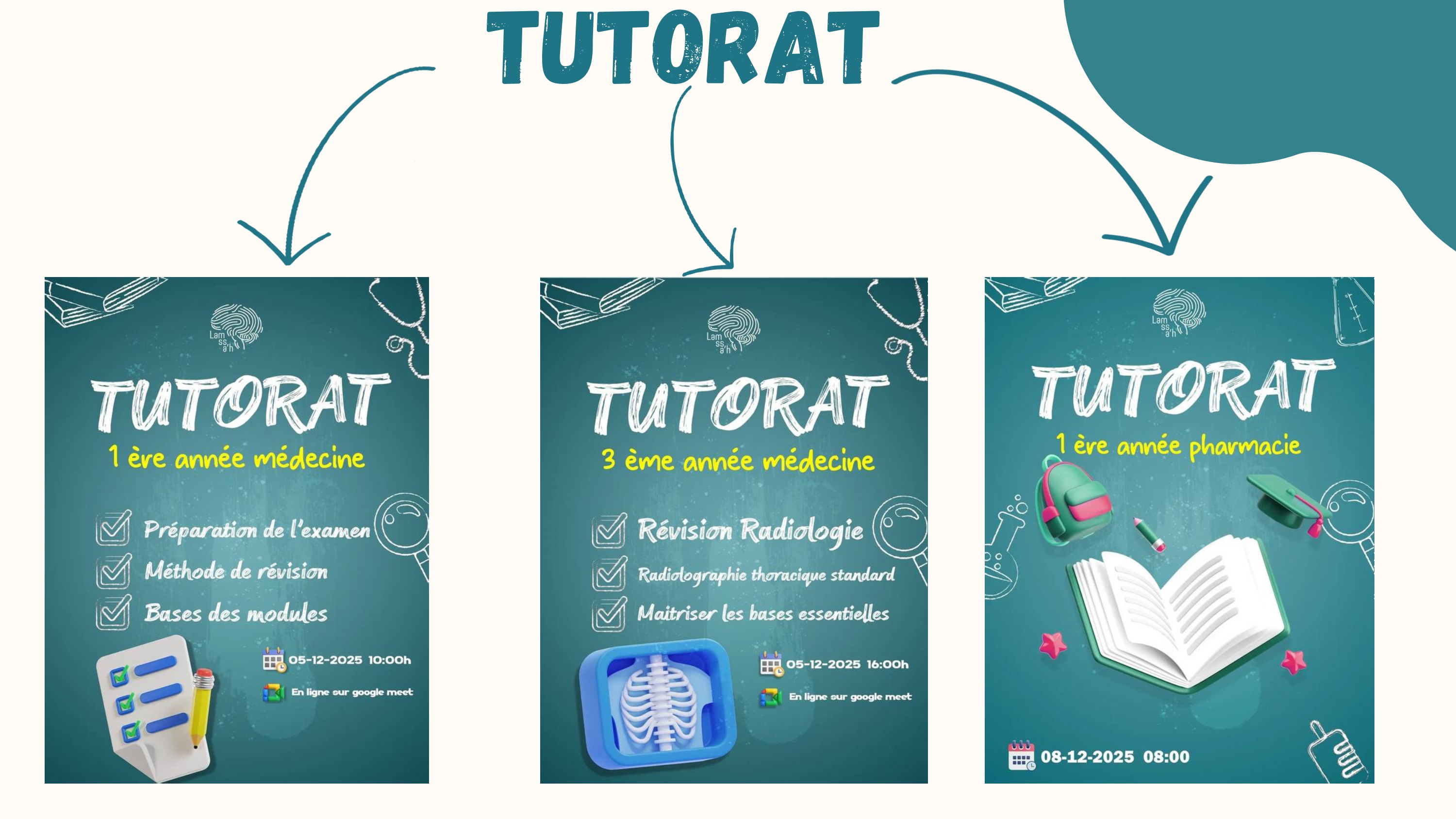 | تقديم نصائح وإرشادات لطلبة السنة أولى طب مع اقتراب اجتياز امتحانات السداسي الأول | حصة نصائح وإرشادات لطلبة السنة أولى طب | 80 مشاركا | على الأنترنت | نادي LAMSSAH | تكويني | 05.12.2025 |
