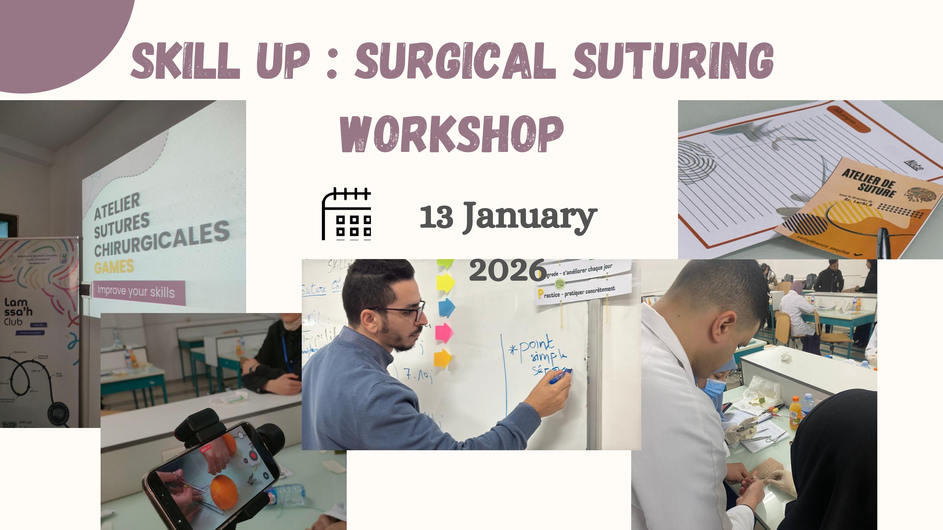 | تكوين نظري وتطبيقي في الخياطة الجراحية بإشراف الطبيبين العربي وسعيد مجاهد المختصين في الجراحة | ورشة تكوينية في الخياطة الجراحية | 30 مشاركا | كلية الطب | نادي LAMSSAH | تكويني | 08.12.2025 |
