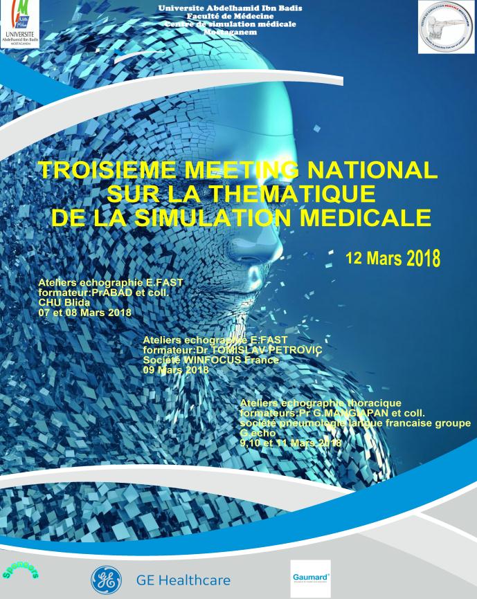 Le troisième meeting a eu lieu le 12 mars 2018 avec invitation de toutes les facultés de médecine algériennes, le programme a comporté un échange et présentation des expériences en matière de simulation avec notamment les experiences des facultés d’Oran, Annaba, Ouargla et Mostaganem. Des ateliers d’échographie ont eu lieu en marge du meeting en échographie clinique d’urgence E-FAST, organisé avec la société internationale WINFOCUS, avec participation de Dr Tomislav Petrovic ; et échographie thoracique avec la participation de la société pneumologie langue française SPLF et le groupe G-Echo sous l’égide de